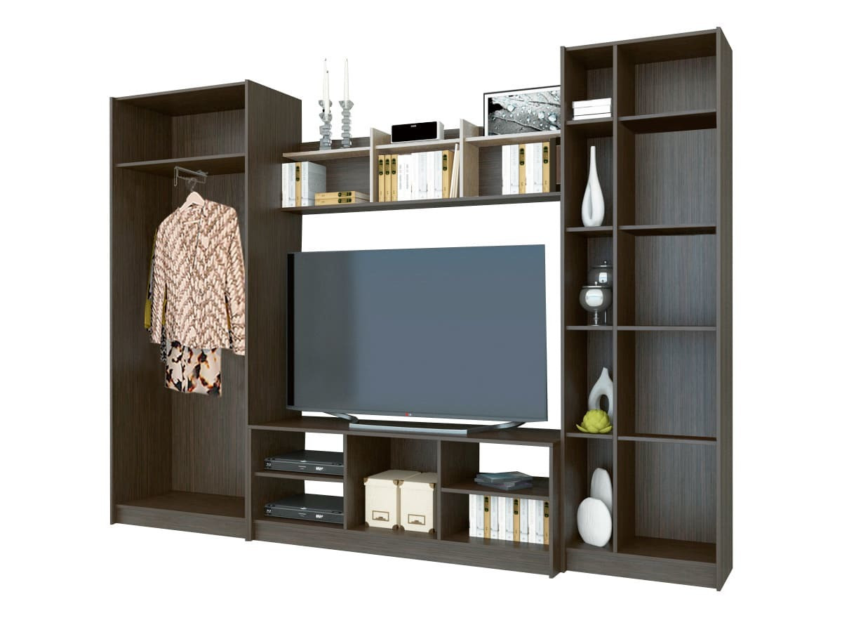 Гостиная МИЛАН с правильными формами и четкими линиями - оригинальное решение вашего интерьера. Контрастное сочетание текстур дерева вносит в интерьер некий акцент. Также, в стенке предусмотрен вместительный шкаф с выдвижной шиангой, что очень удобно при обустройстве однокомнатных квартир.