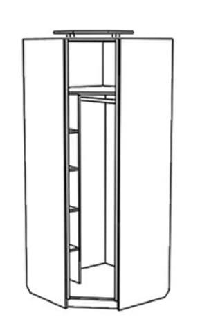 Особенности шкафа: Шкаф предназначенный для организации плавного перехода на углах комнаты из одной плоскости гарнитура в другую. Внутри шкаф имеет три отделения. Слева расположено отделение с четырьмя полками. Сверху полка для мелких вещей или головных уборов. И справа отделение со штангой для вешалок.